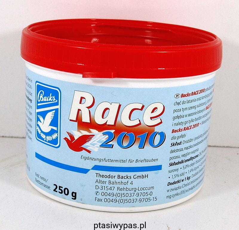 Sposób podawania: przed pierwszym lotem treningowym podawać przez 5 dni, nastepnie przez 3 dni po każdym locie. RACE 2010 jest bardzo wydajny i należy do stosowac bardzo oszczędnie: 1 płaska miarka (2g) na 20 gołębi 1x dziennie przez karmę.