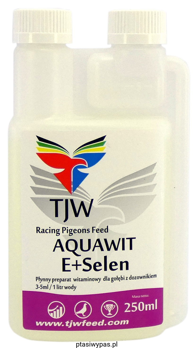 Zalecenia: Stosowanie AQUAWIT E+Selen zapewnia wysoką sprawność układu hormonalnego oraz rozrodczego co warunkuje poprawę płodności oraz wylęgowości. Naturalna witamina E w połączeniu z selenem jest bardzo dobrym antyutleniaczem i chroni organizm przed działaniem wolnych rodników. Witamina E ma duży wpływ na budowę mięśni oraz podwyższa wydajność lotową.